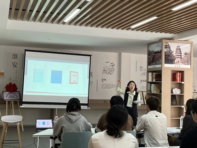 在培训环节,淮安书房绘本阅读指导专家邵雪蓉老师为同学们带来了题为《运河绘本教案设计要点与技巧》的讲座。她从绘本解读、运河元素挖掘、指向核心素养的绘本教学设计要点等方面展开,通过案例解读的方式培训宣讲团成员如何借用图片、实物、动画、声音、身体语言等帮助读者理解文本信息。