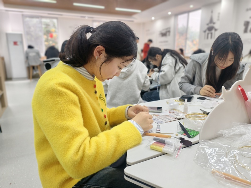 活动中,大运河文化文史社团的同学们在志愿者的指导下,以宋锦的经典纹样为核心,通过两种独特的载体进行了创作实践。一部分同学体验了“宋锦纹样掐丝工艺”,将宋锦繁复精美的图案以金丝勾摹,定格于画板之上,感受线条与色彩的融合之美;另一部分同学则投入了“宋锦主题团扇制作”,将典雅华丽的宋锦纹样与素雅的团扇相结合,在一粘一贴间,体会古典风韵与现代设计的巧妙对话。