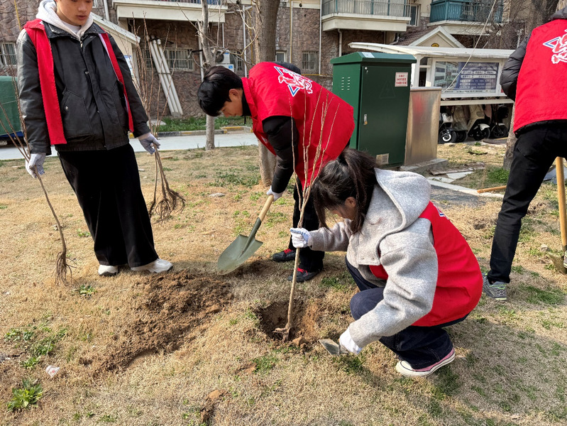3月12日上午9时,志愿者们准时抵达活动现场。在社区工作人员的指导下,大家迅速分组分工、有序协作,迅速投入到植树活动中。挥锹挖坑、扶苗扶正、填土压实、提水浇灌,各个环节衔接有序、细致严谨。身着红马甲的志愿者们干劲满满、热情高涨,忙碌的身影成为社区一道靓丽的青春风景线。